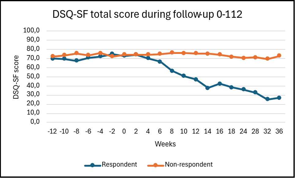 Like other ME patients, at pretreatment they had a wide range of symptoms: fatigue, sleep problems, pain, neurological problems such as brain fog and sensory hypersensitivity, autonomic problems such as nausea and irritable bowel, unsteadiness and balance difficulties when standing up, lack of temperature control and immune problems. All experienced PEM – increased symptom pressure after exertion above a threshold. However, a few weeks after the first treatment, the groups with clinical response experienced milder and less frequent symptoms, with decreasing PEM. A symptom score (DSQ-SF) showed a corresponding reduction of severity in responding patients. In the figures, week 0 is time of the first daratumumab injection