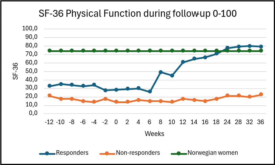 Measured with the standard health survey SF-36, the Haukeland team found that the 10 females in the pilot study split into two groups. Four showed no improvements with the drug, but for the six with clinical response, improvement was marked. Responders started to notice gradual recovery from about 6 weeks after the treatment started, and their physical health status (SF-36 PH) increased week by week. 6 months after the first treatment, the physical health status of the ME patients was at the average for Norwegian women.